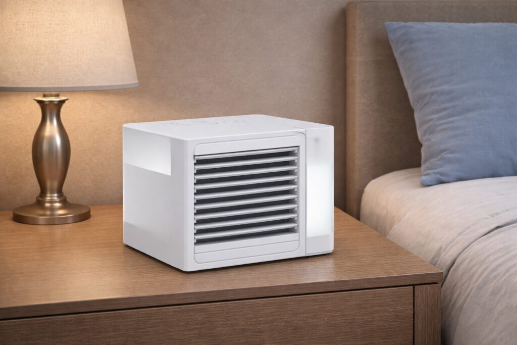 Een stille mini airco zoals de FlinQ of Vulpes Goods is geschikt voor gebruik dichtbij je bed, maar verwacht geen volledige koeling van de ruimte.
